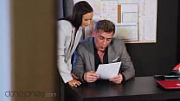 Spanish secretary Mina Moreno adored Dane Jones's big, natural tits over her desk.