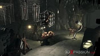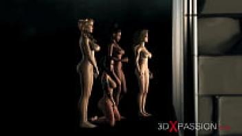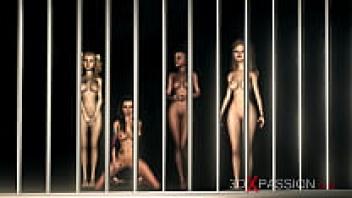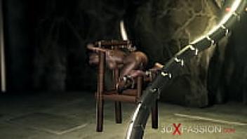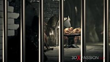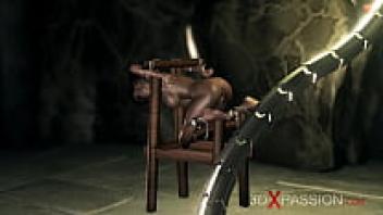 In the gloomy dungeon, a young, stylish victim is adored by large, muscular males.