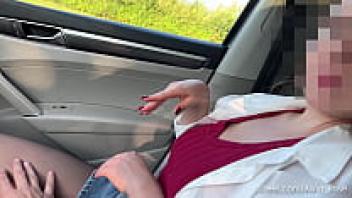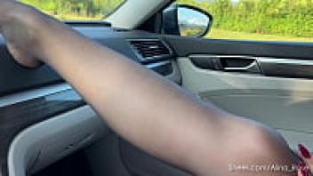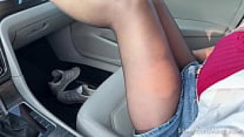 In the car, the cheating wife gives her lover a footjob while wearing panties.