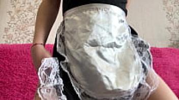 A hairy pussy is caressed by a sexy maid who is not wearing pants, and she experiences an orgasmic experience.