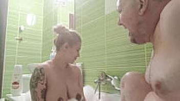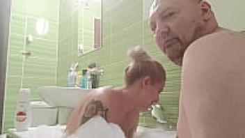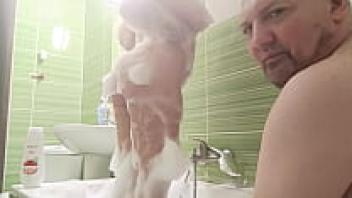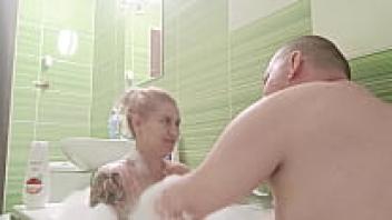 In the bathtub, a gorgeous blonde with large, natural tits cleans his dick.
