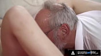 After hot, sweaty, passionate sex, the petite tanned youngster swallows his cum and puts the ancient grandpa's cock in his mouth.