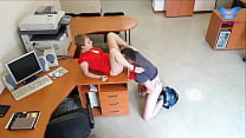 In the office, a lustful secretary sits beneath the table and sucks off her boss.
