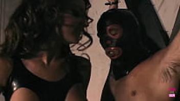 Beautiful dominatrix swallows her masked man's long shaft while tying him up.