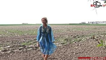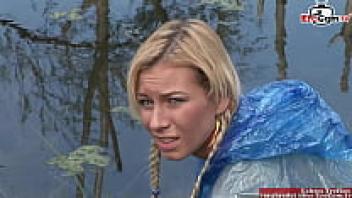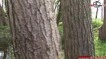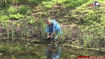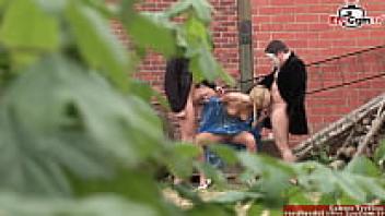A trim blonde in a threesome outside with natural tits FMM
