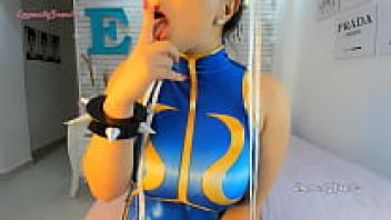This sexy cosplay girl is dressed as Chun Li from Street Fighter, and she is playing with her Htachi vibrator, cumming, and wetting her pants and panties. Ahegao.