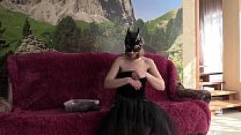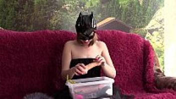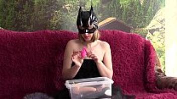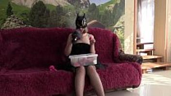 A girl swallows a large rubber dick while wearing a vinyl mask and a vibrator in her luscious pussy.