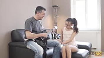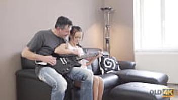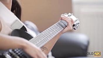 OLD4K. A cute European brunette and an elderly guitarist had sex on the couch.