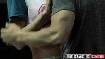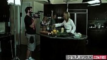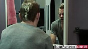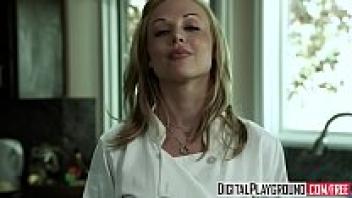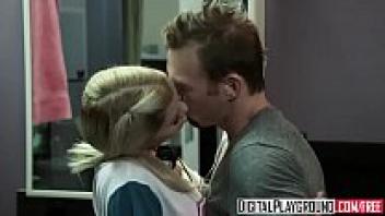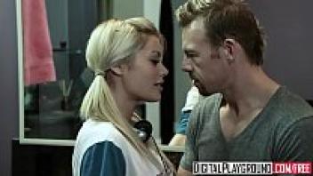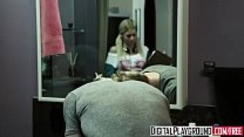 In the restroom of Digital Playground, Riley Steele's character, a pigtail blonde, gets her stepfather's cock.