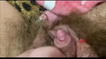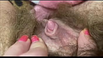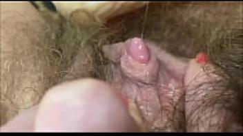 Intense Closeup Wet, hairy pussy rubbing the big clit during an orgasm