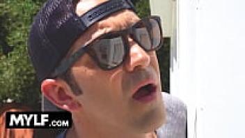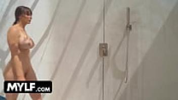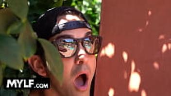After a sweaty workout, a horny neighbour was caught snooping on a perfect assed milf taking a shower in her backyard.