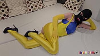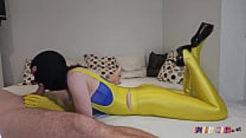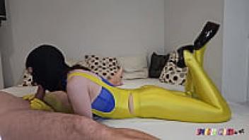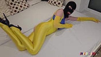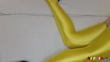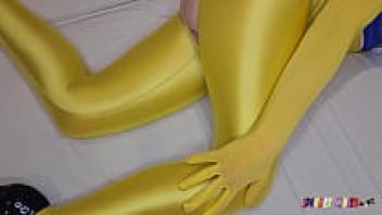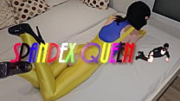 The SpandexThe queen jerks him off her yellow spandex body after sucking his dick.