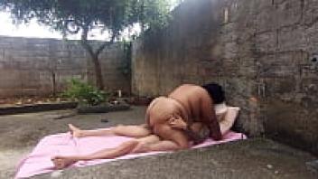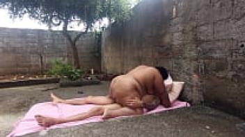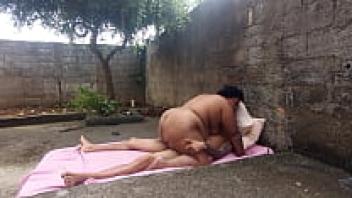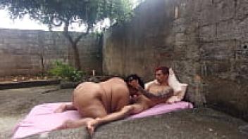 In the backyard, eating the obese married woman