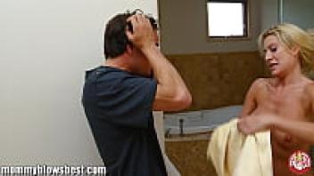 When Stepmom is getting ready to take a shower after work, she notices her stepson watching and masturbating and wants his thick cock inside of her.