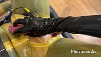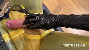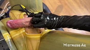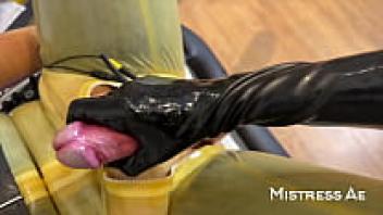 POV latex gloves Madame Li Ying, our rubber gimp, and a double domme hand job edging tease with electro stim