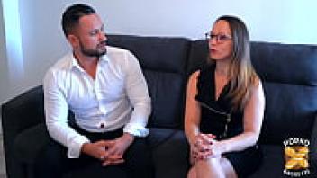Hollie Hughes, MILF, rides a cock in her garter belt while wearing glasses.