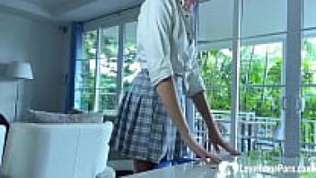 A student babysitting in a skirt and stockings took a creampie in her tight pussy and sucked a large cock.