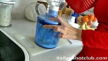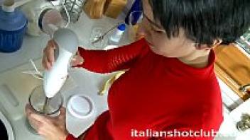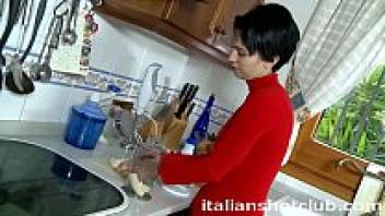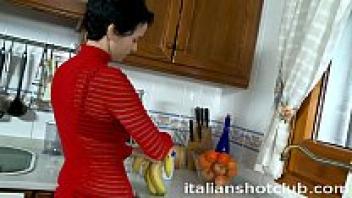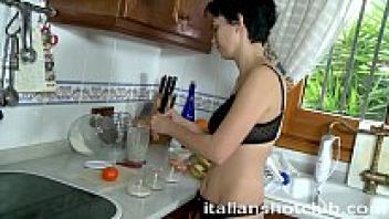Creampie is served to a hot brunette in the kitchen.