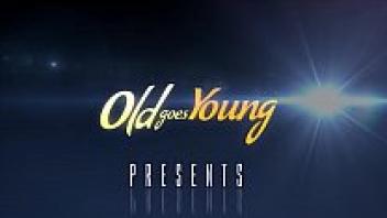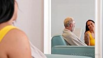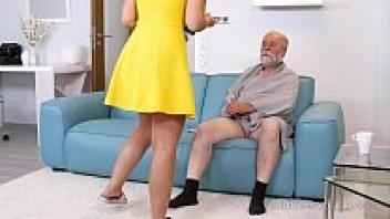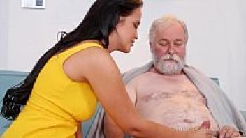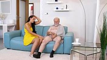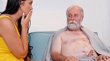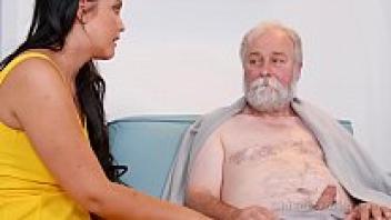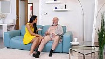 An elderly man lounging on a couch is visited by a dark-haired beauty.