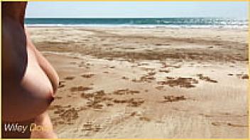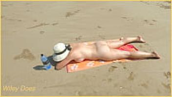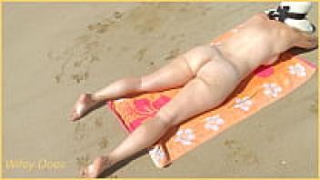 Miss Creamy flashing in public while nude on the beach, squirting, and taking a big cock cumshot in front of everyone