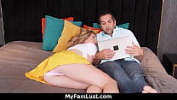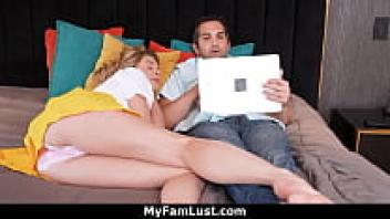 In order for her stepfather to jam his large cock into her wide opening, the young brunette widens her ass.