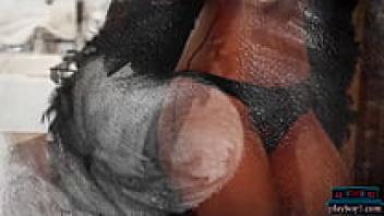 Li Moon, a petite, all-natural Asian beauty, posed in a sexy garment prior to a striptease