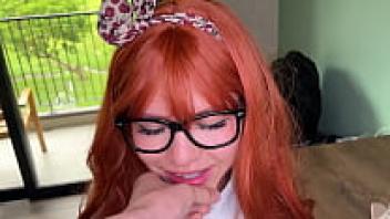 An amateur GF blowjob with a large facial cumshot on a redhead