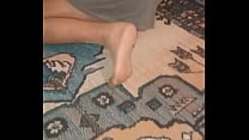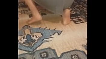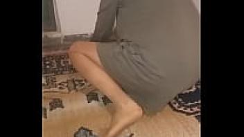 A mature Turkish woman uses gorgeous tulle socks to clean the carpet.