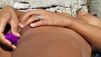 On a nudist beach, a very attractive Latina is seen squirting while playing with a toy.