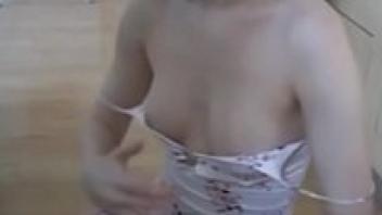 At a webcam, a German escort hooker with large tits and tattoos performs a solo strip dildoshow.