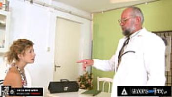Ioana, a gorgeous teen, takes her old doctor's cock out of his pants for a closer look.