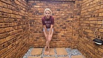 a blonde toilet is licking the toilet and flushing her head, and she wants you to urinate on her.