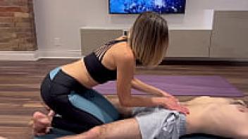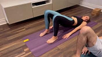 While working out, the wife receives affection and a creampie from her husband's friend while wearing yoga pants.