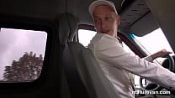 Two guys in a van are loved by a skinny mature.