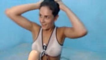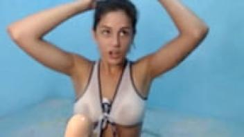 Hot Solo Brunette in Lingerie Sucking Big Dildo Closeup