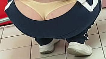 Pretty young brunette girl is getting ready for her first upskirt flashing session at work. She is very excited about this opportunity.