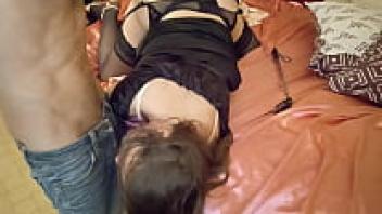 A French amateur babe wearing a black dress, black satin panties, a black satin garter belt, stockings, heels, a rimming technique, a doggystyle, and sex toys in 1984