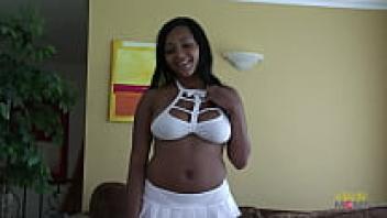 A ebony chick with big tits makes a white cock vanish in her shaved pussy.