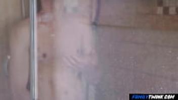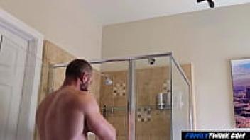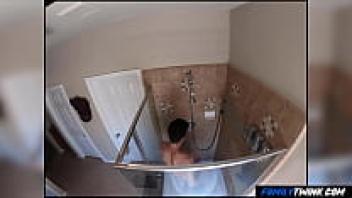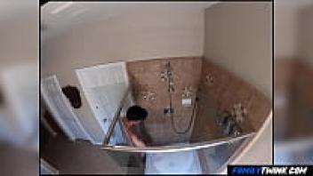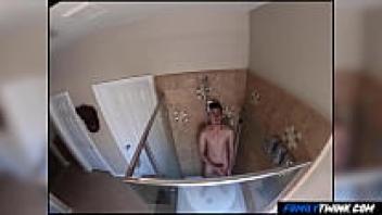Using a hidden camera, a muscular stepfather was able to spy on his stepson as he was using the restroom.