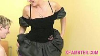 An extremely aroused old man with a shaved cunt is licking sperm off his young dick and then in cunt