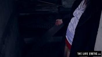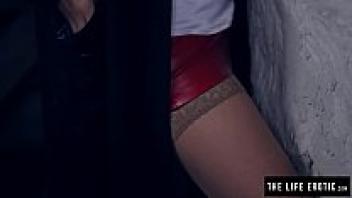 In the filthy alley, a furious female wearing glasses and with swollen nipples masturbates vigorously.