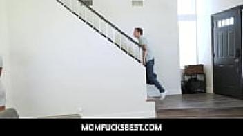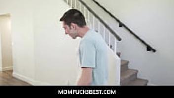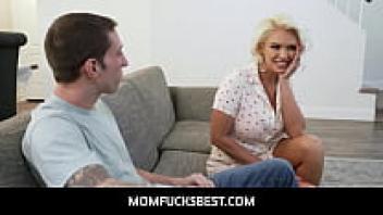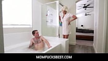During a sexual encounter, Charli Phoenix, a blonde American stepmother, enters the bathroom of her stepson.