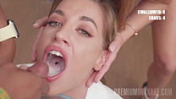 Ohana Petite consumes 52 enormous mouthfuls of cumshots while eating PremiumBukkake.