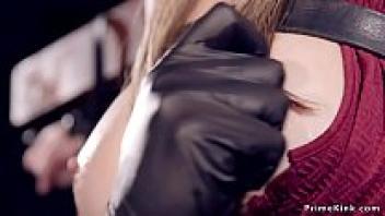 In bondage, a hairy pussy slave rides on top of a Sybian.