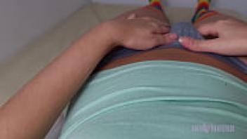 Riding on your face: closeup of a female in a pink skirt moaning while stroking her puffy outie pussylips in a custom video - Asmr fingering