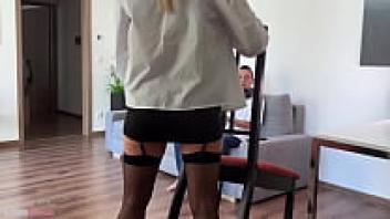 In the office, a lustful secretary sits beneath the table and sucks off her boss.