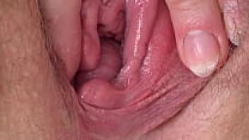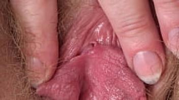 Close-up of an erect clitoris and wet vagina. A chubby milf masturbates her hairy pussy while wearing nylon pantyhose. homemade fetish.