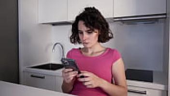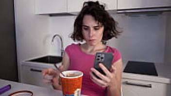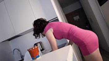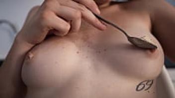 Darcy Dark engages in pussy masturbation and ice cream consumption in the kitchen.