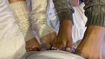 Eye-deprived blonde and brunette giving one guy a handjob and blowjob | chatting filthy | cum in eyes | POV FFM THREESOME