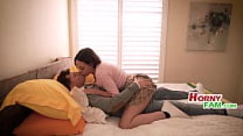 One lucky guy in a wild foursome (step-sister, step-mother, and girlfriend) shared a bed!